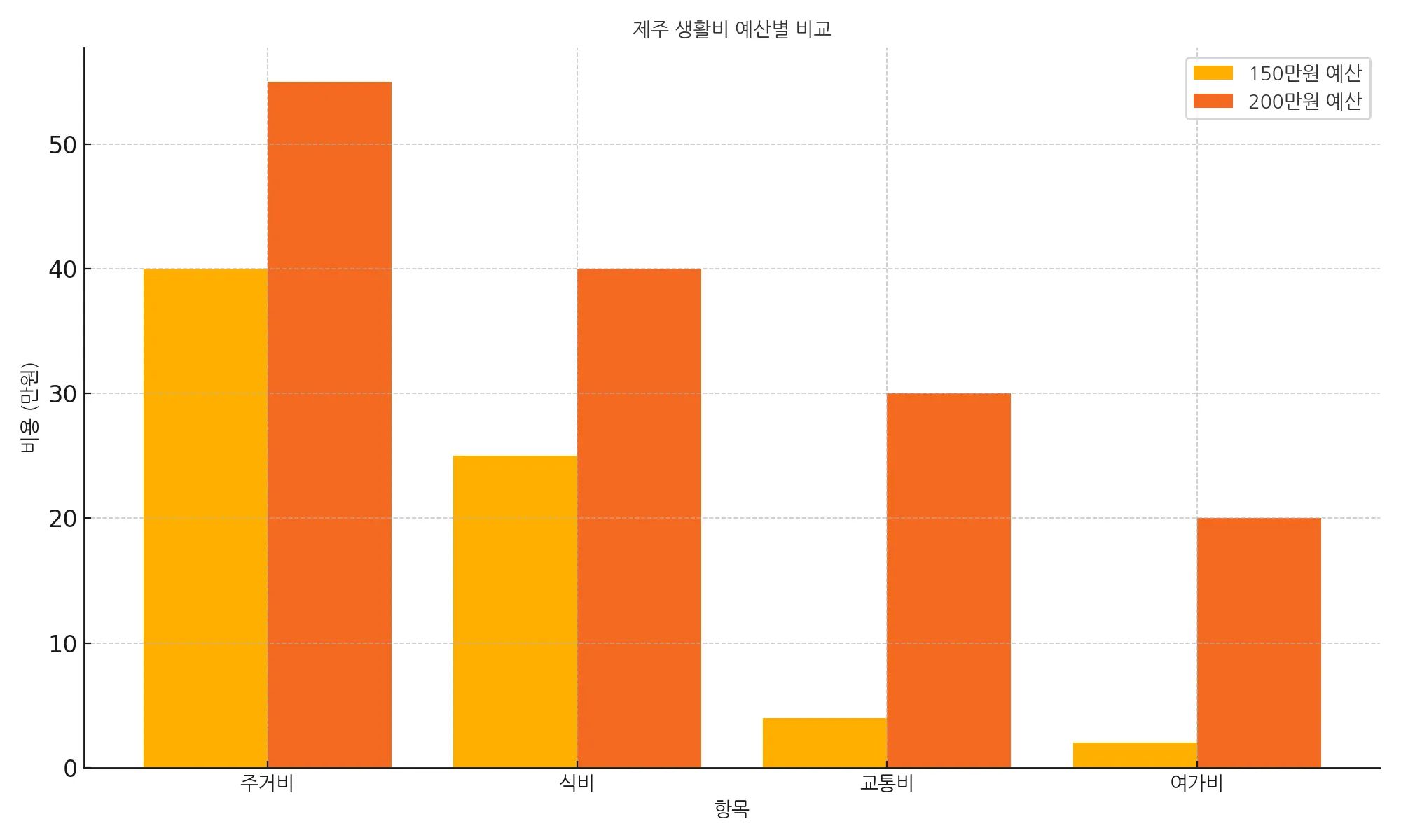 실제 제주에서 150만원과 200만원으로 생활하는 경우, 항목별 지출 패턴은 어떻게 다를까요? 두 가지 라이프스타일을 예산별로 상세히 분석해 보겠습니다.
